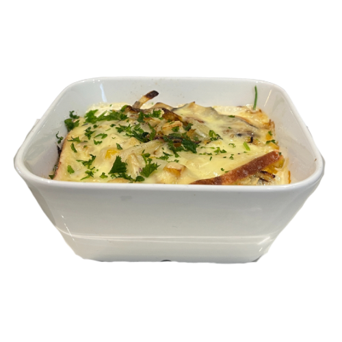 Traditionnel : pomme de terre, crème liquide, tofu bio sans gluten, oignon jaune, raclette fumé bio.